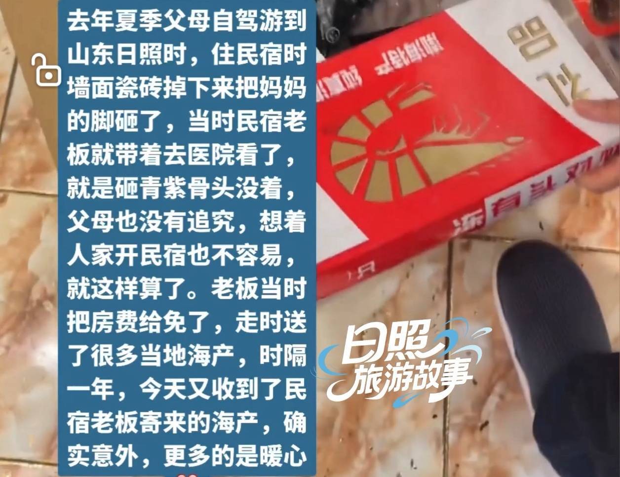 据网友“我爱天晴”讲述,故事的缘故是旧年夏日的一次日照自驾之旅。那时他带着父母改日照游玩,入住这家民宿时,墙面瓷砖不测零散砸到了母亲的脚。民宿雇主得知后,陪并吞家东谈主赶赴病院检查,所幸仅仅局部青紫,并未伤到骨头。过后,雇主不仅免去了房费,在他们离开日照时,还有益奉上了崭新海居品抒发歉意。本合计这件事就此画上句号,没念念到时隔一年,民宿雇主竟还追想着他们,专程寄来满满一箱海味,这份出乎意想的温情,让一家东谈主深受感动。