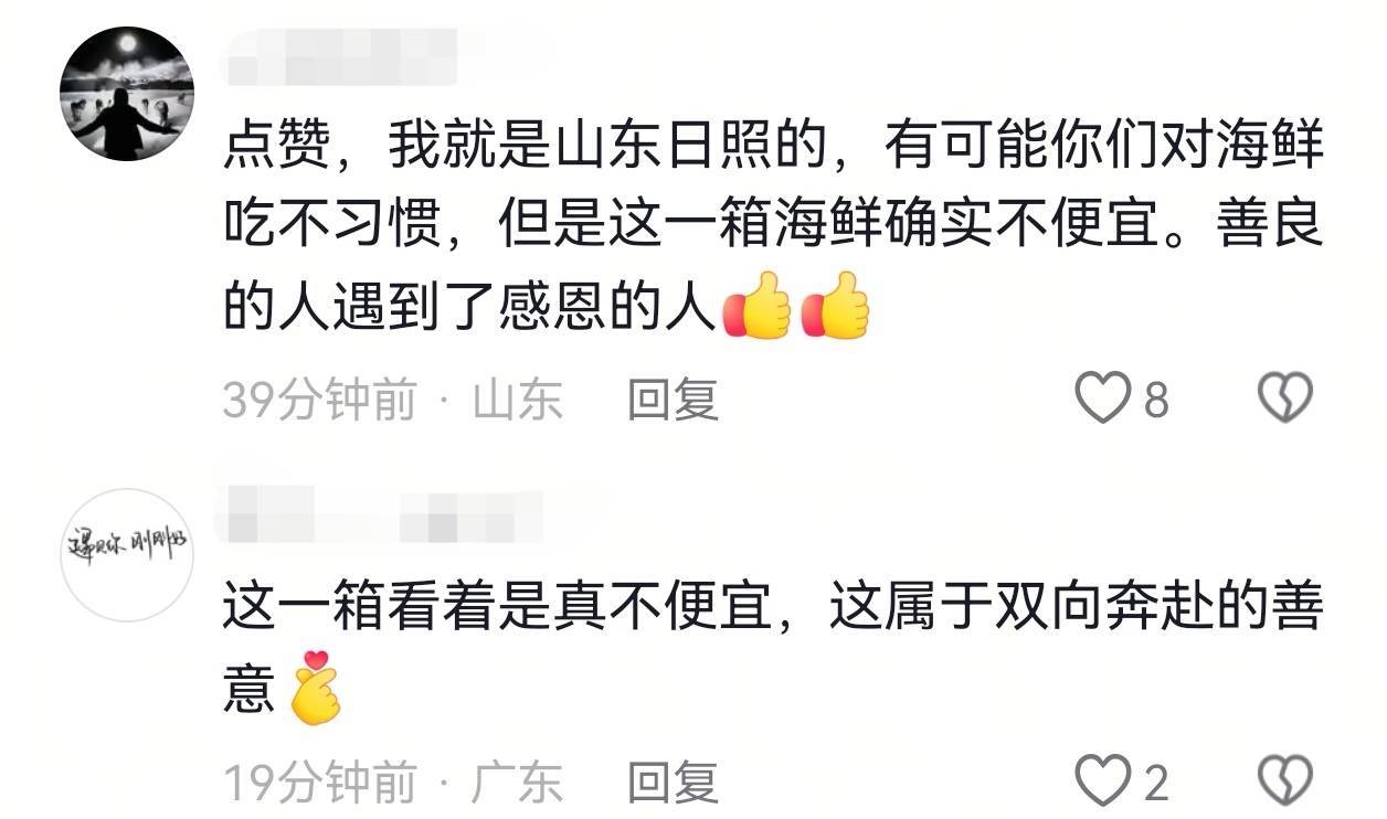 “这海鲜礼盒全是硬货,价值腾贵,这份情意更是无价!”“必须为日照的民宿雇主点赞!”“大日照东谈主便是这样敞亮,这份真善好意思太戳心了!”