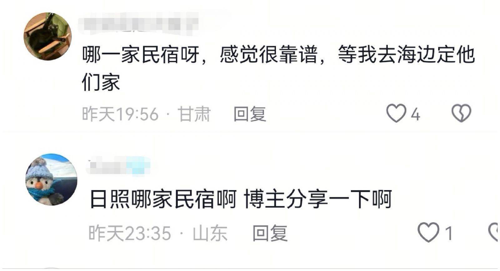 “哪家民宿?下次去日照平直订!”“求民宿名字,这样靠谱的雇主,必须支持!”“被这家民宿圈粉了,去日照海边就选它!”