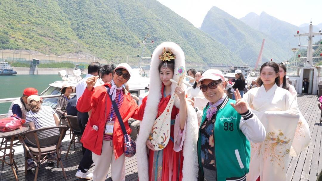 告别昭君村的东说念主文底蕴,旅行团前去峡口旅游船埠,准备开启高峡平湖游船之旅。船埠边,昭君艺术团的后生演员们身着典雅汉服,手握团扇,在游船进口处温雅欢送旅客,汉服翩跹与春日暖阳逸趣横生,营造出浓郁的文化氛围。