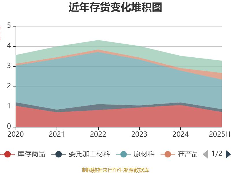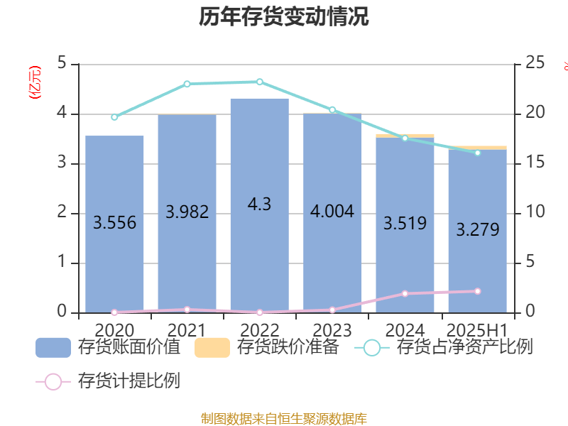 从存货变动来看,适度2025年上半年末,公司存货账面价值为3.28亿元,占净财富的16.05%,较上年末减少2403.96万元。其中,存货跌价准备为714.08万元,计提比例为2.13%。