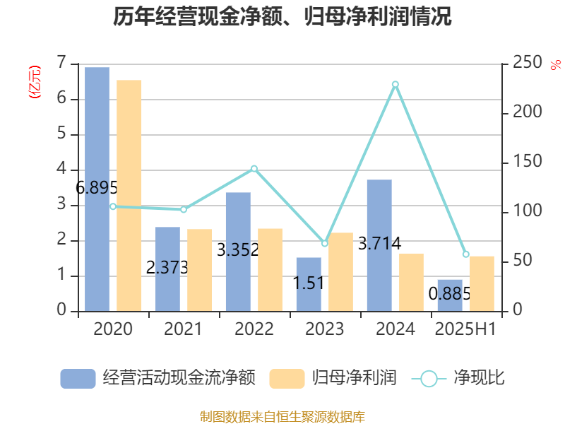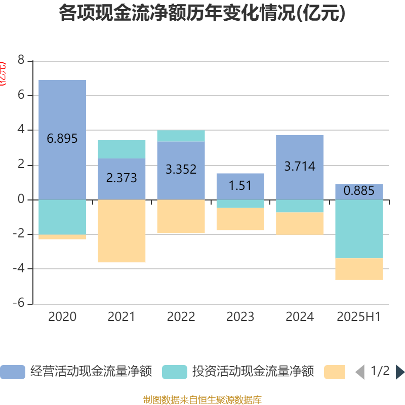 2025年上半年,公司规划看成现款流净额为8851.51万元,同比着落54.07%;筹资看成现款流净额-1.24亿元,同比减少7.88万元;投资看成现款流净额-3.38亿元,上年同时为-2.25亿元。
