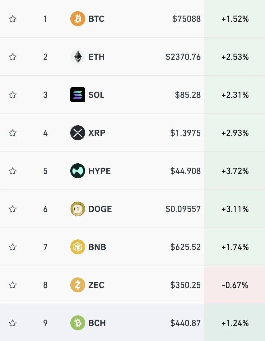 加密货币集体大涨,比特币冲上75000好意思元,日内涨超1.5%,以太坊涨超2.5%,狗狗币涨超3%。