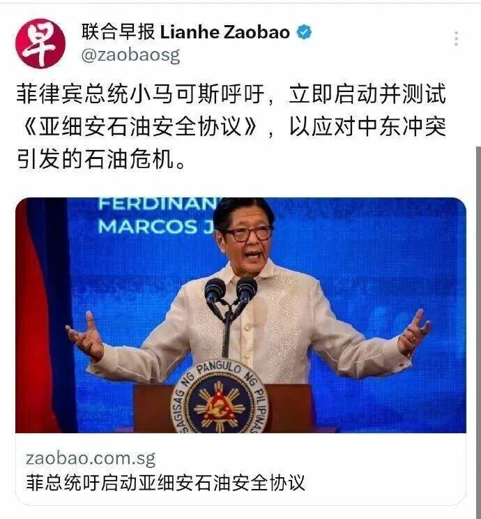是以小马科斯就抖了个贤达,连忙布告进入国度费劲情景。这么,菲律宾就成了能源危急最严重的国度,况兼菲律宾是2026年东盟轮值主席国,东盟应当有动静吧?