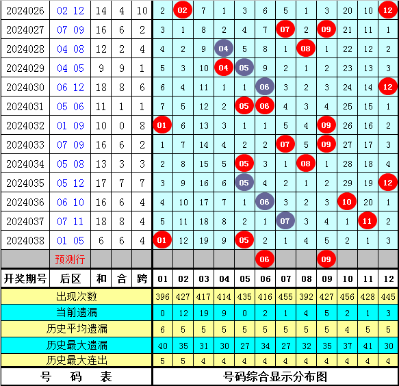 其下期分手开出奖号:05-03-02-04-05-15,各号码遗漏期数为:5期、5期、9期、8期、2期、4期,温冷号码开出比例较高。